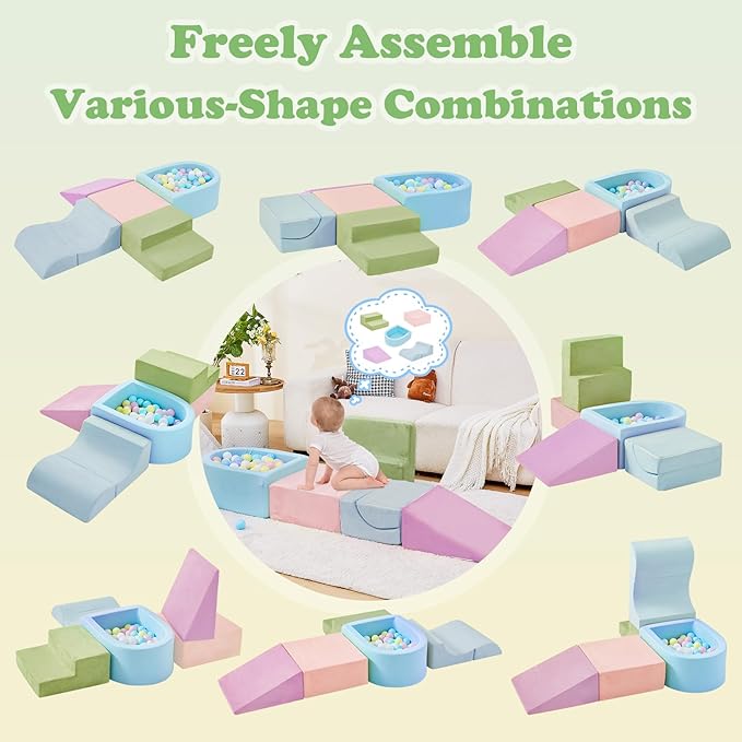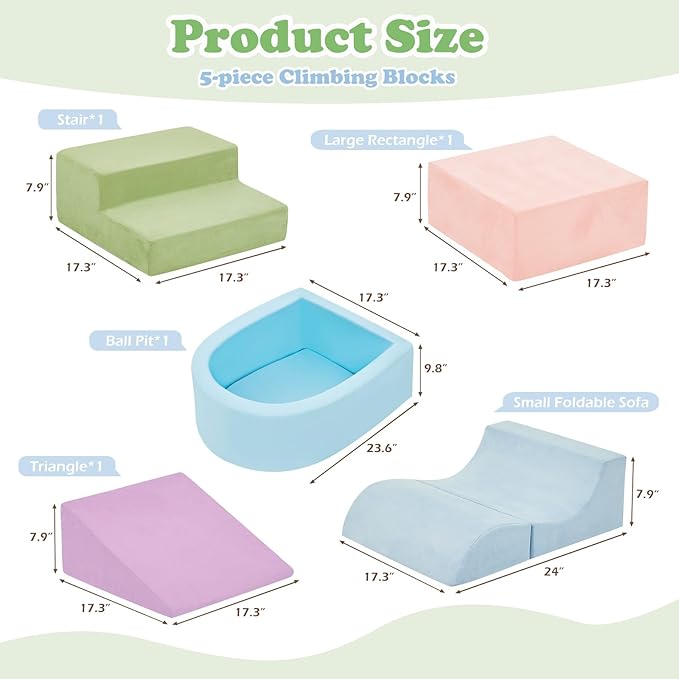 • 5 Pieces Foam Climbing Blocks: Our foam climbing blocks with an integrated ball pit (capable of holding up to 100 balls, balls not included) are crafted from non-toxic, and odorless materials, ensuring a safe and enjoyable play experience. The hidden zippers are designed to protect delicate skin from scratches, providing peace of mind to parents and a sense of security for children. Engineered without harsh edges or solid structures, these foam blocks safeguard little ones from accidents, allowing them to play, toddle, and roll freely