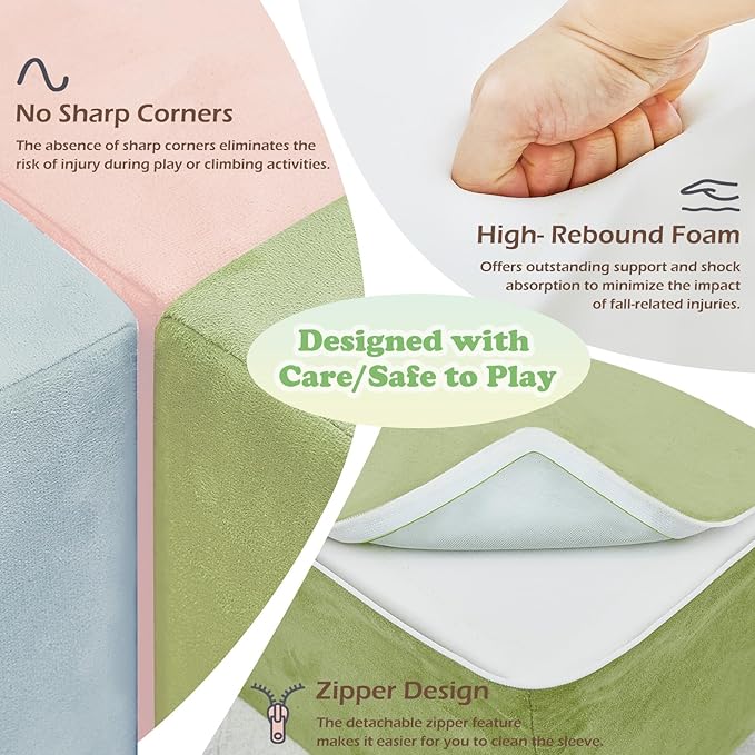 • Removable and Washable Fabric Cover: The Climbing blocks features removable& washable fabric cover, the inclusion of a removable fabric cover adds convenience and versatility to the product. Parents can easily remove and wash the fabric cover, keeping the climbing toys looking fresh and vibrant, ensuring a hygienic play environment for their little ones