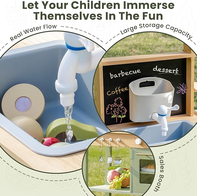 - 【Imagination & Social Development】 With the outdoor mud kitchen for kids, kids can mimic adult behaviors, fostering their social skills and enhancing their narrative abilities, all while staying engaged and active.