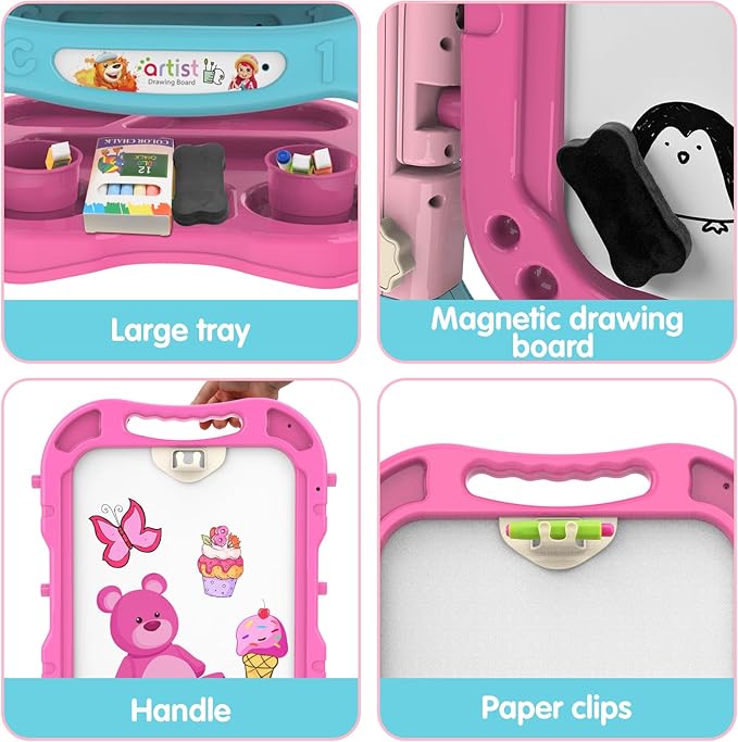 - 360°Free Rotate & Height Adjusting: This double-sided easel has an adjustable height between 30" and 34.6". It is easy to adjust the height to sure meet the different needs of children aged 3 years old. The quick flip board also make the board easy to access and painting at any angel.