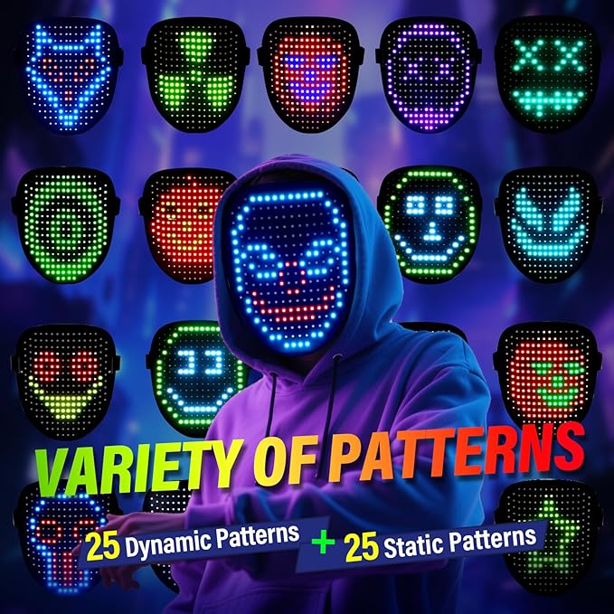 - 25 Graphics and 25 Dynamic Patterns: 50 cool cosplay costume mask can be cyclically switched through gesture sensing mode or buttons, Whether it's cosplay parties, birthdays, Halloween, Christmas, Carnivals, or Concerts, LED light up masks are the perfect choice