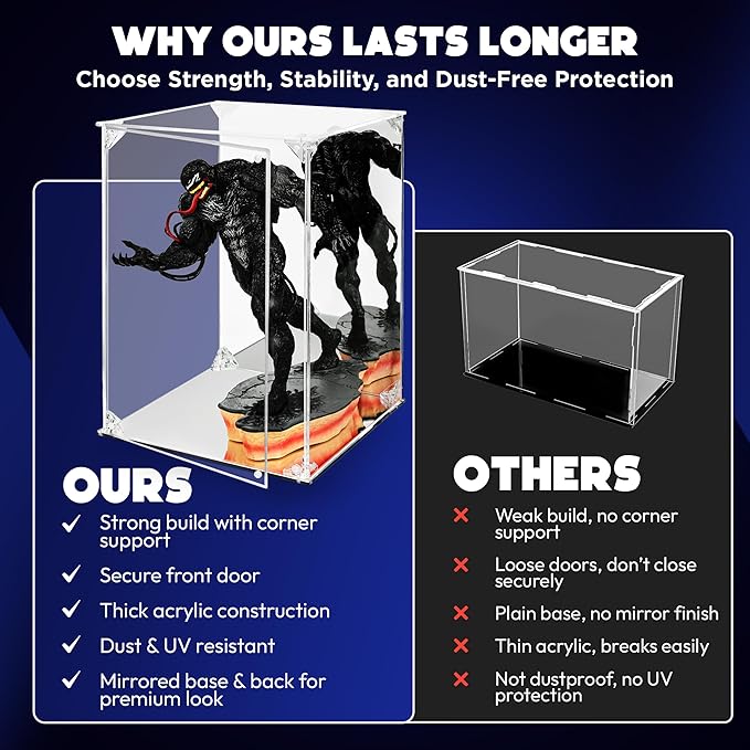 - 【ACRYLIC DISPLAY CASE】JEFTOM acrylic display case is a masterpiece to showcase your favorite collectibles with a touch of sophistication and elegance. The clear display box has a more comfortable and beautiful appearance which can be implemented independently. Its sturdy construction offers a reliable shield against daily exposure, ensuring your collectibles remain in pristine condition.