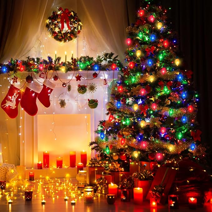 - 🎄· UL Certified & Waterproof : This Vintage Christmas lights is made of weatherproof material. Designed with IP44 waterproof rating, these outdoor strings lights are built to withstand rain, snow, and harsh weather conditions. C7 Colorful Christmas string lights outdoor waterproof are UL listed for outdoor and indoor to use, perfect for outdoor holiday displays like roof, tree, garden, proch, yard, as well as indoor decor for Christmas tree, mantel, window and parties.