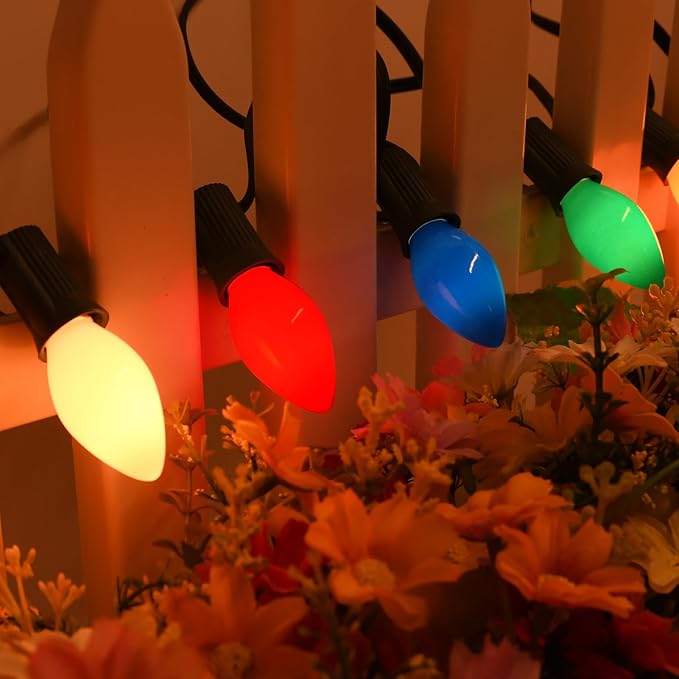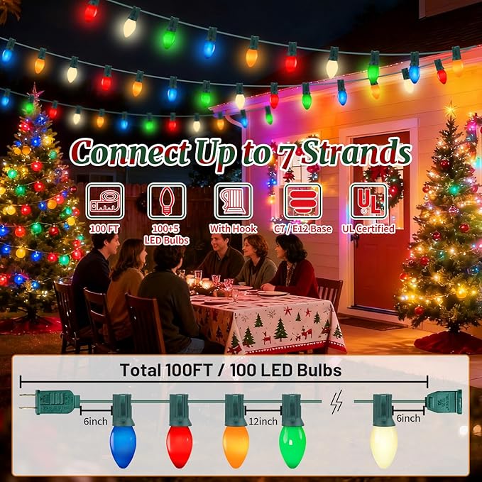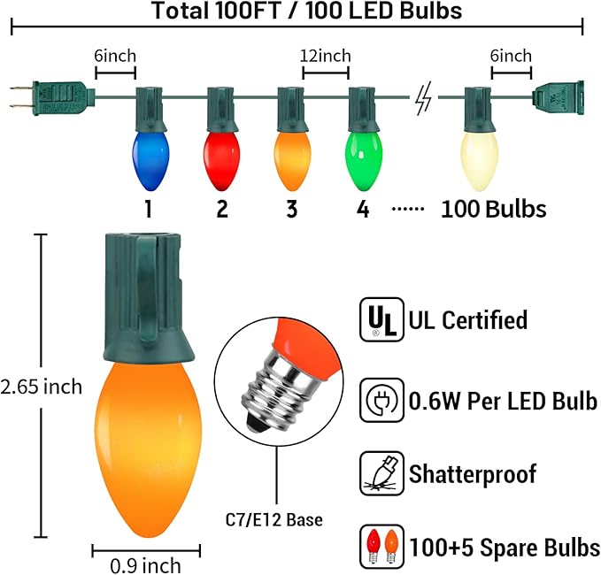- 🎄· 100Ft C7 LED Christmas Light String: 100 ft multicolored christmas lights outdoor featuring 100+5 bulbs in red, green, blue, white, and orange (includes 5 spares). Each C7 LED bulb operates at 0.6W/120V with C7/E12 candle base sockets. C7 bulb dimensions: Length 2.65 inches, Width 0.9 inches. Bright light source combined with vibrant bulb casing colors creates a warm, festive ambiance. Ideal for illumination and decoration in holiday setting, festive celebration, winter patio, porch, door/window, wall, party, and Christmas tree lights decorations.