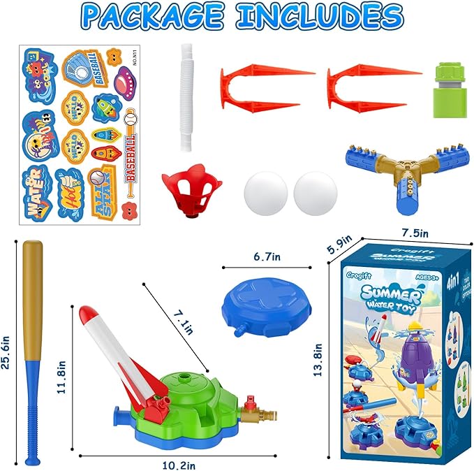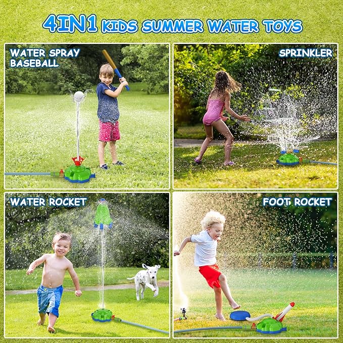 - 【4-In-1 Water & Baseball Toy】Our water sprinkler toys includes 360°rotating water sprinkler, water rocket, foot rocket, water baseball toys and flying rocket launcher for kids. The large spray area and splashing water creates a cool toddler outdoor toys for kids ages 4-8, allowing kids enjoy more fun in summer outdoor activities. Simple to assemble to enjoy four different play experiences that your child will love!