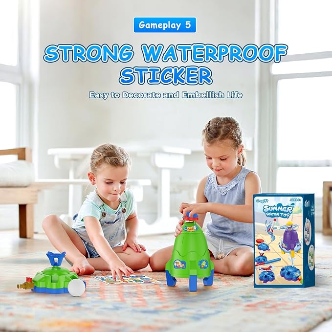 - 【DIY Rocket Launcher】 The sprinkler toys comes with cartoon stickers that allow children to personalize their rockets according to the instructions on the packaging, stimulating their learning abilities and fostering their creativity. Strong waterproof stickers, easy to decorate, embellish life, not easy to fall off. All kids will love this fun and cool water toy and enjoy the cool backyard toys with the family.