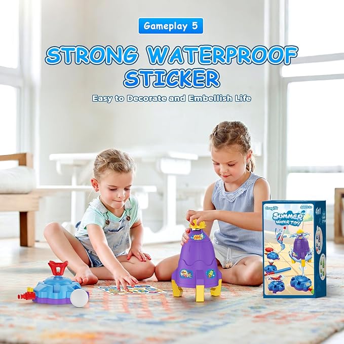 - 【DIY Rocket Launcher】 The sprinkler toys comes with cartoon stickers that allow children to personalize their rockets according to the instructions on the packaging, stimulating their learning abilities and fostering their creativity. Strong waterproof stickers, easy to decorate, embellish life, not easy to fall off. All kids will love this fun and cool water toy and enjoy the cool backyard toys with the family.