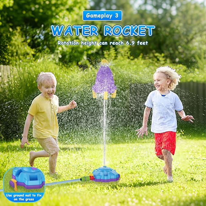 - 【4-In-1 Water & Baseball Toy】Our water sprinkler toys includes 360°rotating water sprinkler, water rocket, foot rocket, water baseball toys and flying rocket launcher for kids. The large spray area and splashing water creates a cool toddler outdoor toys for kids ages 4-8, allowing kids enjoy more fun in summer outdoor activities. Simple to assemble to enjoy four different play experiences that your child will love!