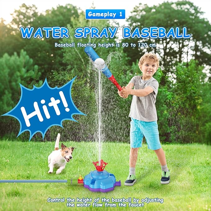 - 【Water Spray Baseball】 Sprinkler toys combine water play with baseball training, providing hours of entertainment for kids. Water Baseball toy's Launcher launches one water balls at a time up to 80-120cm in heights! The water sprinklers baseball playset is an ideal outside toys for toddlers 3-5 on summer day, perfect for lawn, kiddie pool, park and backyard entertaining outside activities party and enjoying outdoor games for kids ages 4-8.