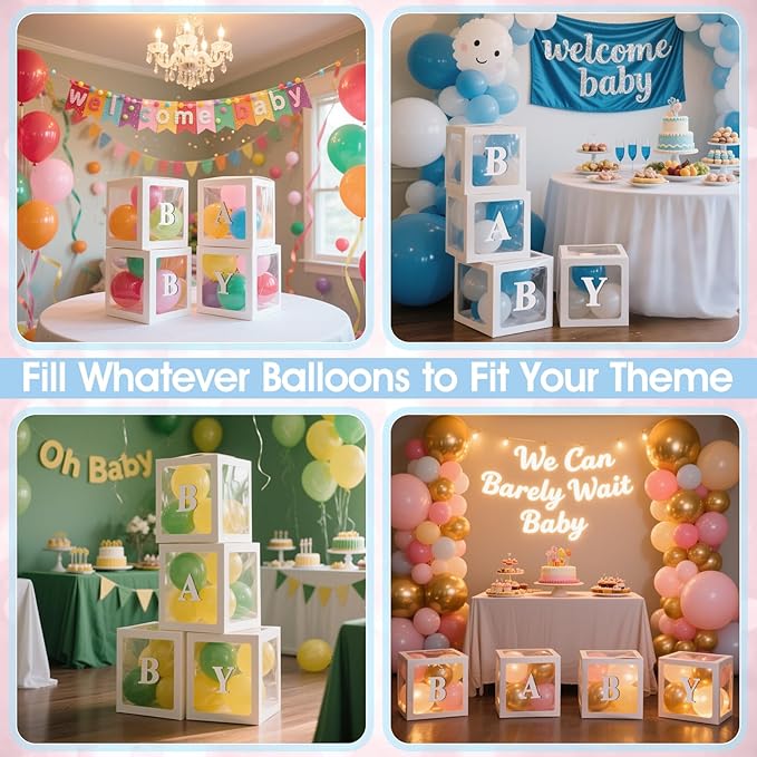 - Package Included : You will receive 4 white balloon boxes(11.8”×11.8”×11.8”), 2 “ BABY ”letter sets and adhesive dots. Stylish and practical, these items are perfect for a variety of occasions like baby shower, gender reveal, birthday party and more. The baby box will add a charming touch to your celebration while creating the perfect decorative backdrop for capturing memorable photos.