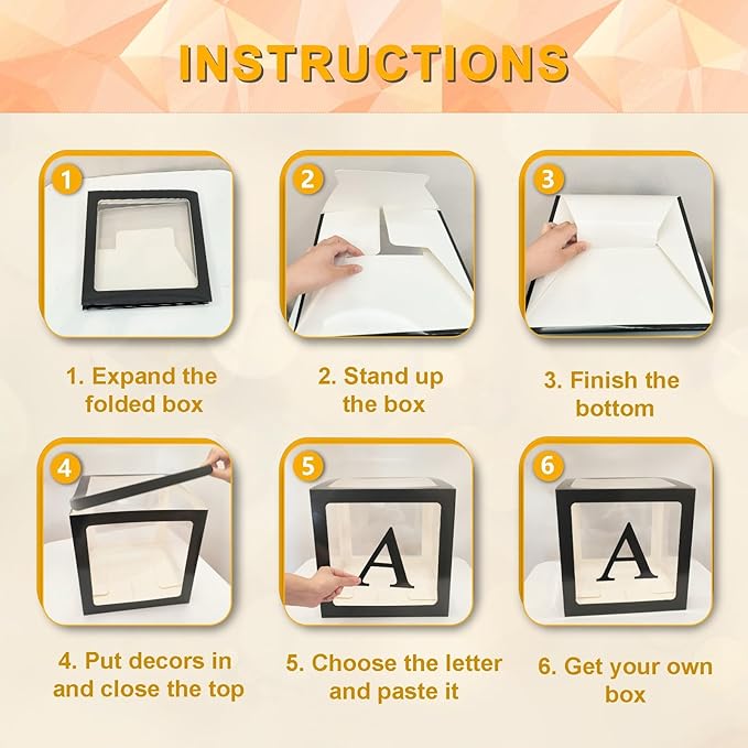 - Easy to Assemble : First, fold the baby balloon box. Next, use adhesive dots to secure the "BABY" letters at the center of the clear window. Finally, place balloons inside the box (balloons are not included). This simple setup instantly turns your party preparation into a breeze. Perfect as an effortless centerpiece for cake tables and creates a charming photo backdrop for unforgettable memories.
