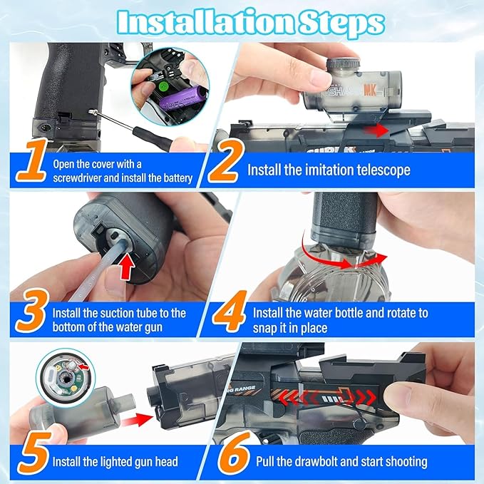 - Large Capacity Battery Design: The water gun comes with a large-capacity battery cleverly hidden in the scope. This ensures extended playtime with a single charge, so you can enjoy uninterrupted summer water battles without frequent battery changes.