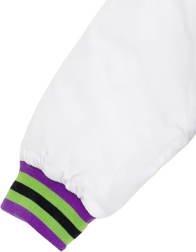 - Dress-up cosplay design; Ribbed sleeve cuffs and waist for a better fit; Zip up front for easy dressing; Functional pockets; Vintage-style varsity jacket; Vibrant sublimation print artwork