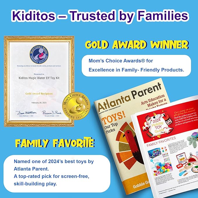 - Interactive Creative Play: Designed for parent-child interaction, parties, and holiday gifts, the Magic Water Elf enhances family time and adds extra fun to creative play sessions. The set also includes a star-shaped plastic bottle, perfect for storing and displaying your water elves as decorative pieces. Kiditos offers a high-quality warranty and excellent customer service to assist with any questions.