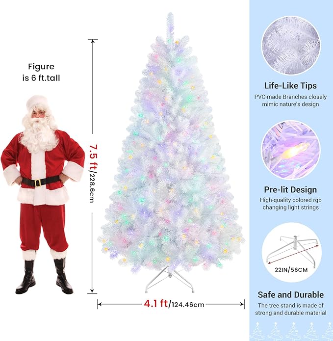 - 【Ideal Size】7.5 feet tall. The pre lit Christmas Tree is 7.5 foot with a 51.96 inch base diameter, an ideal choice for Christmas decorations. you can accentuate different areas of your living space, office, or even a holiday party by customizing your tree with garland, ornaments, and more!