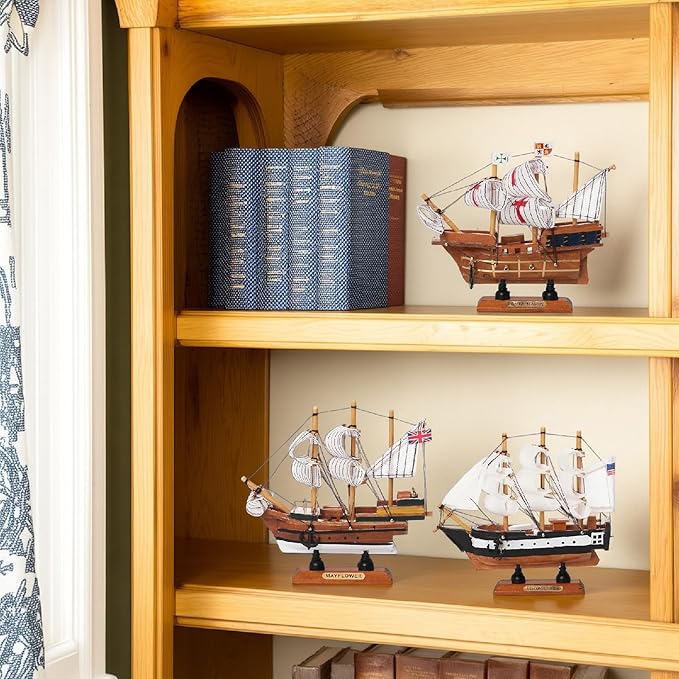Historic Wooden Ship Models 6inch Set 3 Pack, Mayflower, Santa Maria, USS Constitution, Nautical Home Sailboat Decor Gift for Son