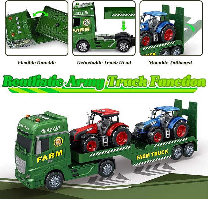 - 【Interactive Vehicle Functions】Truck cab detaches for independent play, tractors roll for farm actions, flatbed adjusts to simulate transport scenes.