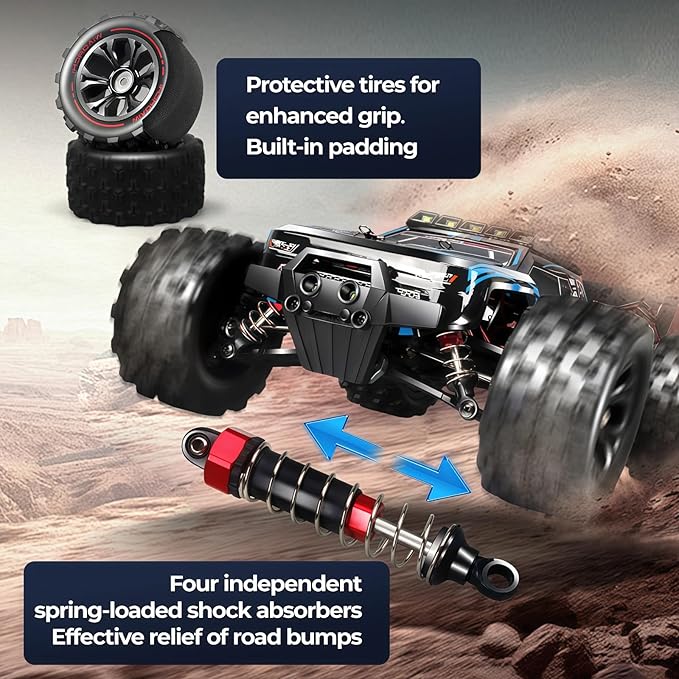 - Driving Quality: Individually sprung shock absorbers for stronger unrestricted handling.RC cars use Individually sprung shock absorbers for stronger unrestricted handling. Four independent shock absorbers are used with tires fitted with built-in padding to effectively alleviate bumps on a variety of road surfaces. Strong off-road performance regardless of terrain.