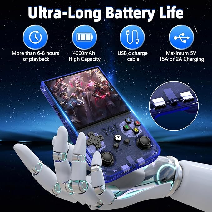 - 【Portable Design with 4000mAh Battery】-Designed for portability, this mini retro game console features a compact and lightweight design. The 4000mAh rechargeable battery offers up to 10 hours of playtime, making it perfect for gaming on the go. It also includes built-in speakers and a 3.5mm headphone jack for an immersive audio experience.