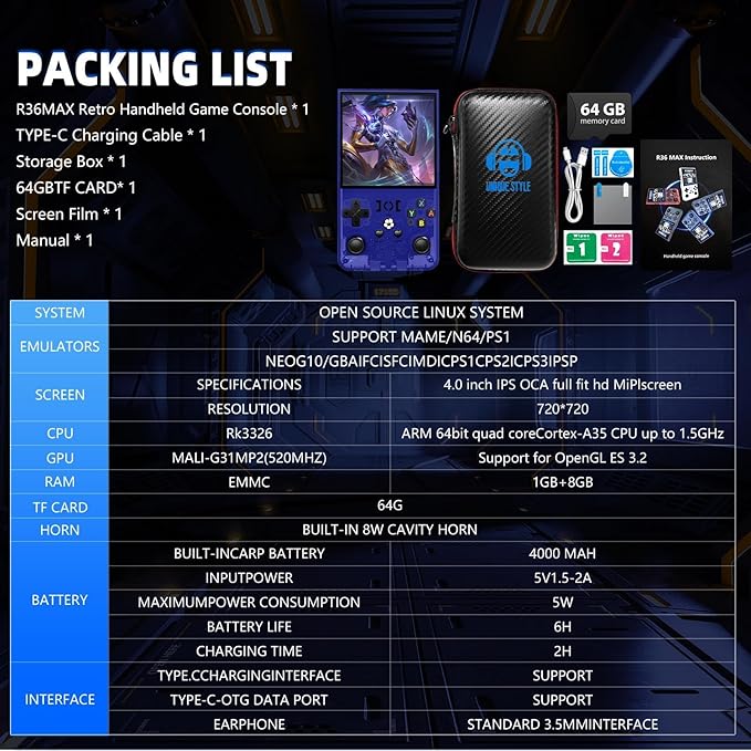 - 【R36MAX New Retro Game System】The R36 MAX is a high-performance retro video game console, equipped with a 1.5GHz 64-bit RK3326 CPU and Linux system with a ARM64bit quad-core Cortex-A35 CPU. It offers a smooth and responsive gaming experience across a variety of emulators.
