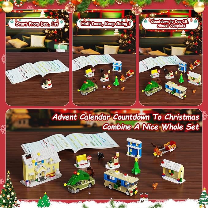 - 【24 Days Countdown Advent Calendar】The 2025 Christmas Advent Calendar unveils daily buildable suprise from Dec 1st to 24th, each numbered door reveals a miniature piece like snowy houses, sleighs, and jolly animals etc.—culminating in a warm holiday scene, making every countdown moment meaningful and unforgetable