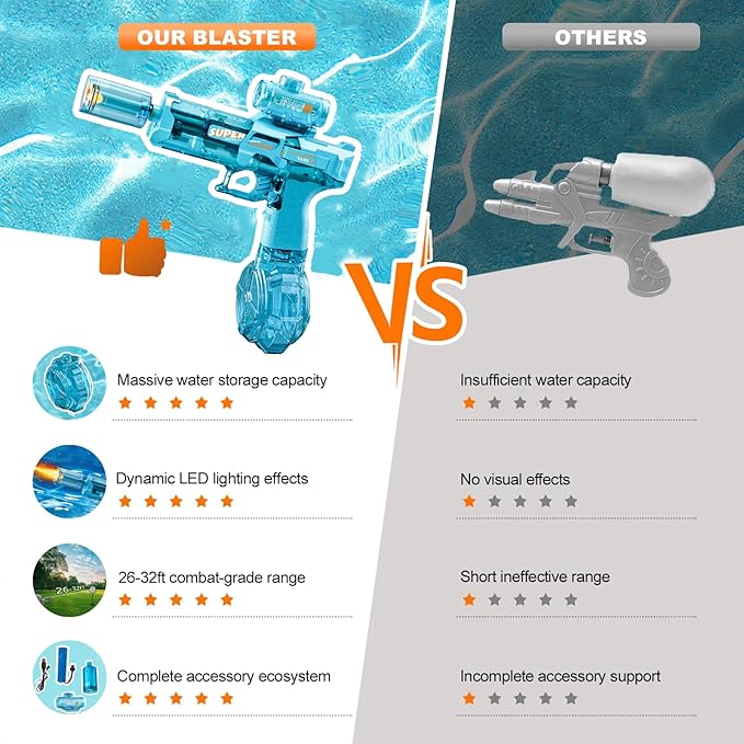 - Long-Lasting & Easy Refills – This watergun holds a lot of water, so you can play for a long time without needing to stop and fill it up all the time. It’s super easy to refill too! Perfect for endless summer fun in the backyard, at the beach, or in the pool!