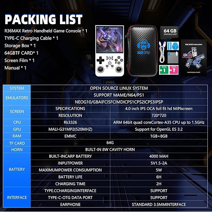 - 【R36MAX New Retro Game System】The R36 MAX is a high-performance retro video game console, equipped with a 1.5GHz 64-bit RK3326 CPU and Linux system with a ARM64bit quad-core Cortex-A35 CPU. It offers a smooth and responsive gaming experience across a variety of emulators.