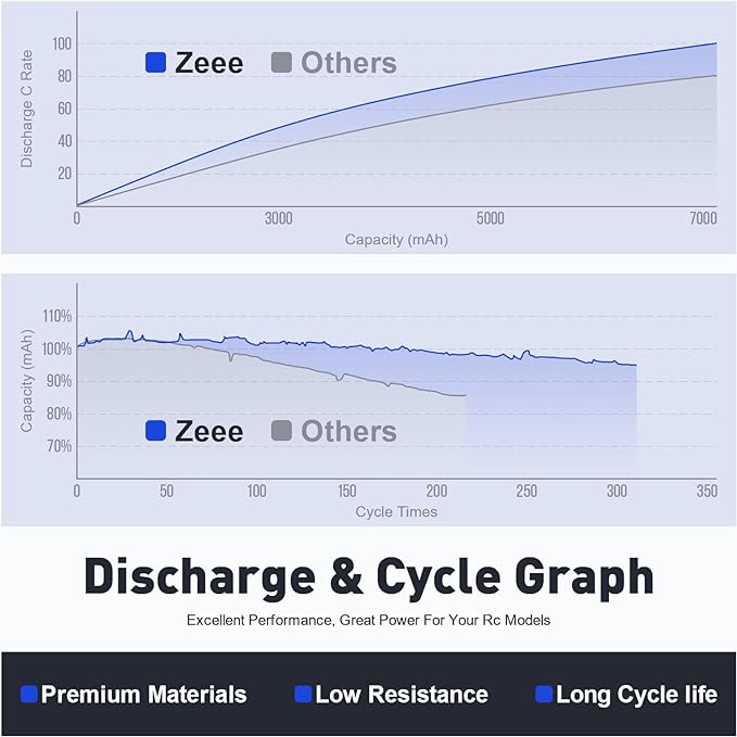 - 【Zeee 2S 7200mAh Lipos Specification】- Battery Voltage: 7.4V; Configuration: 2S1P; Capacity: 7200mAh; Discharge: 120C; Connector type: XT60 Connector.