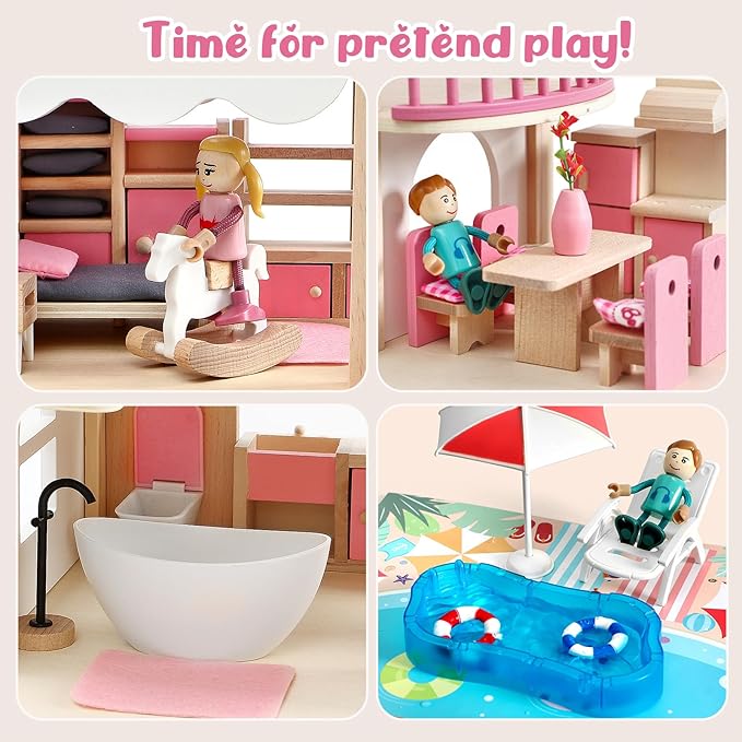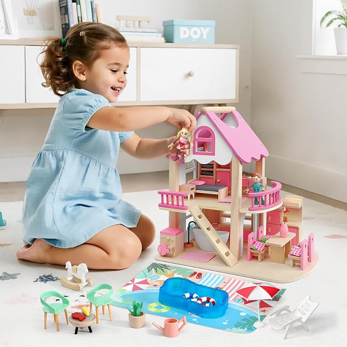- Wooden Dream House - Our pink doll house for kids comes with bedroom, dining room, bathroom, balcony, outdoor barbecue and swimming pool. Each room is equipped with various of furniture and decor. There are totoally 40 pieces of furniture included, allowing children to arrange and design the rooms. A miniature world full of imagination, fun and education