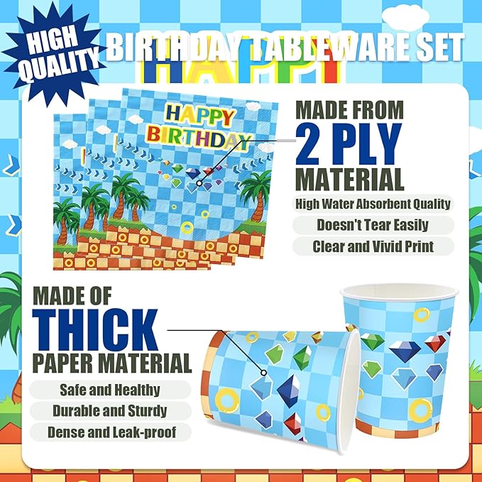 - The package includes: hedgehog themed birthday party supplies including 24 9-inch hedgehog paper plates, 24 7-inch blue hedgehog paper dessert plates, 24 6.5-inch blue hedgehog party napkins, 24 9-ounce paper cups, and 24 blue knives, forks, and spoons, providing ample supplies for 24 guests to enjoy a hedgehog themed birthday party