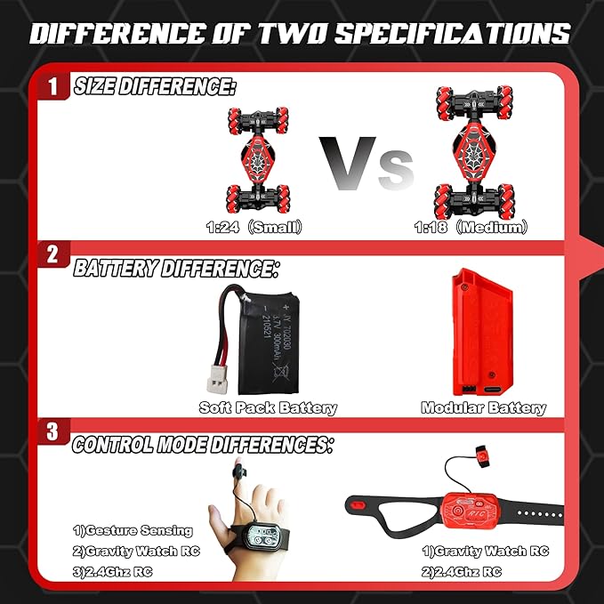 - Cool Spider Gesture RC Car:New Spider remote control car wite three control modes: gesture sensing, remote control, and gravity-sensing watch control; control the RC car can be forward/backward, drift, and perform 360° rotations, giving children an unprecedented driving experience.