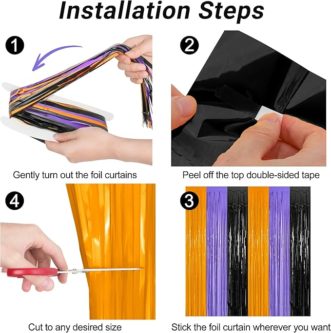 - Easy to Install: These Halloween foil fringe curtains have adhesive paper on the top, just peel the paper off and stick it where you need it, then cut it to the size you need.