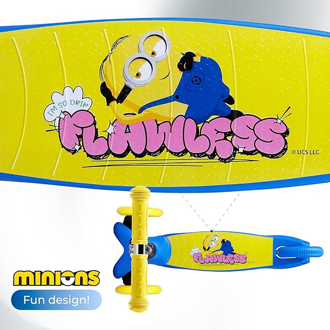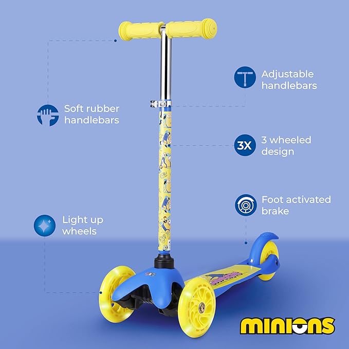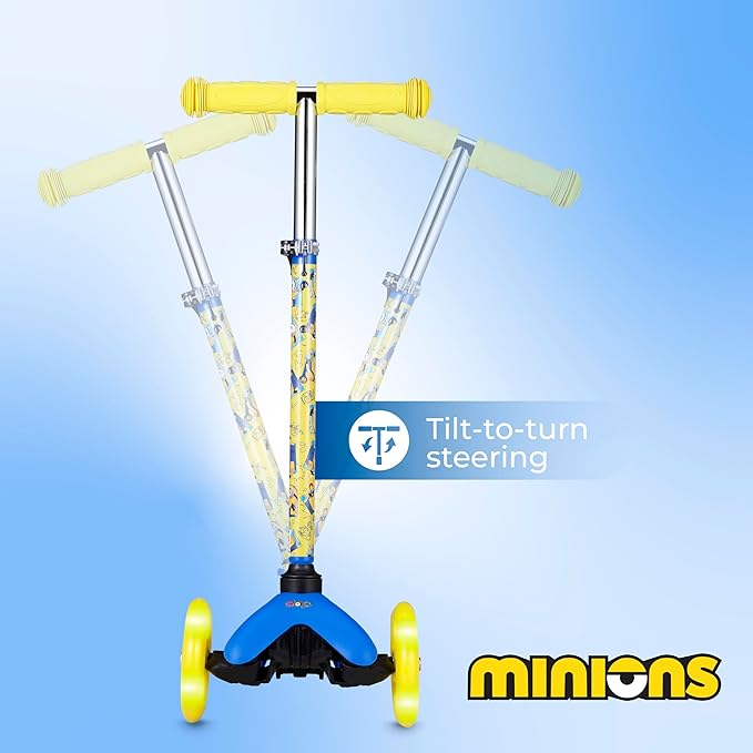 - Safe and Fun: With its Extra Wide, nonslip deck, rear foot brake, and comfortable handlebars, your child will feel as secure as possible while riding the Minions Light Up Kick Scooter! Give your children the safest micro kickboard mini scooter experience you could ask for, with easy-to-use tilt controls, smooth turn steering, and a powerful foot brake.