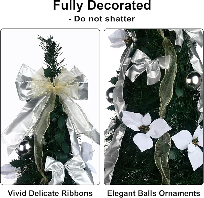 - PRE-DECORATED - 6.5ft tall Christmas tree is pre-decorated with ornaments, ribbons, artificial poinsettia flowers and bowknots, saving your time.