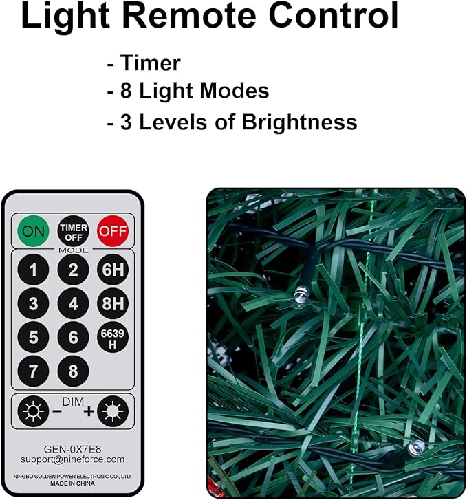 - POP UP CHRISTMAS TREE WITH LIGHTS REMOTE TIMER - The pre-lit Christmas tree has built-in 200 LED string lights. The lights have 8 lighting modes. You can use the remote to choose among 6/8 hours timers, adjust the brightness, and switch the lighting mode you like.