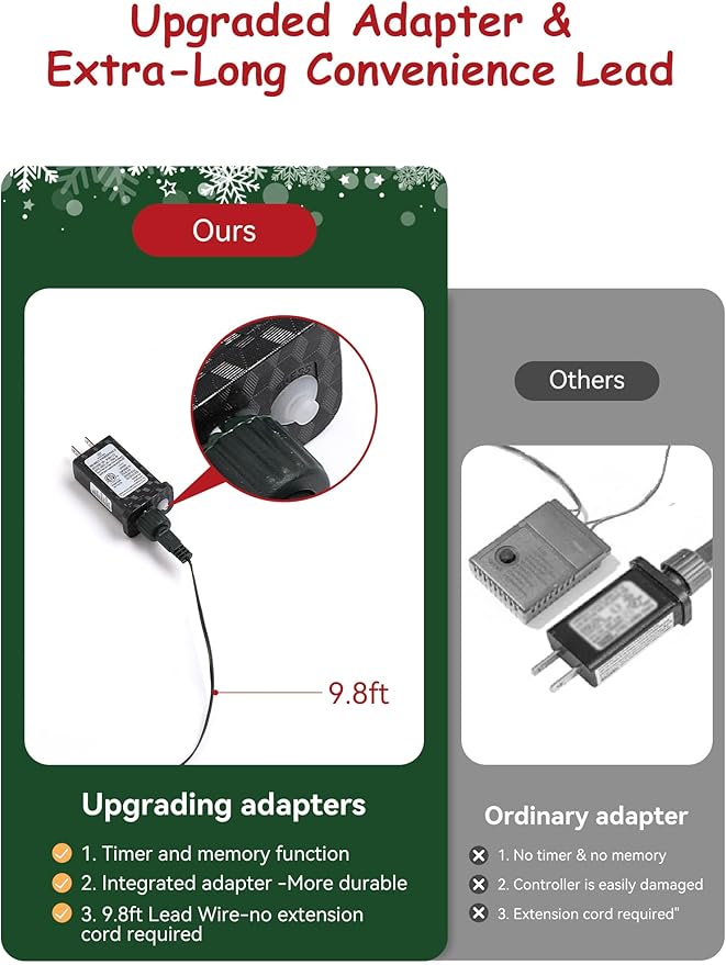 - 【Energy-Saving & Convenient Timer】Powered by an ETL-certified all-in-one adapter for safer and greater durability, with a 9.8ft long lead—no need for extension cords, even in different scenarios. The christmas wreath with lights has a built-in timer (auto on for 6hrs, off for 18hrs) and memory function, saving energy while avoiding repeated settings.