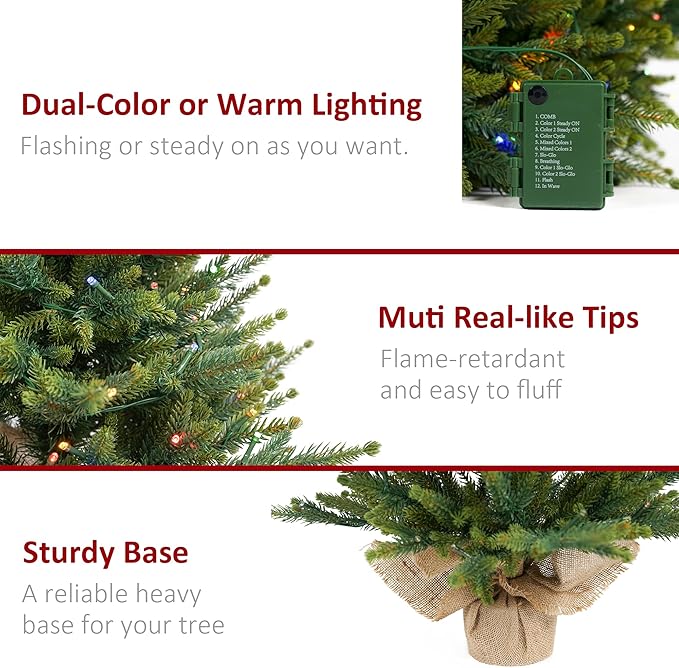 - Prelighted Christmas Tree: This 2 FT Tabletop christmas tree make of many high quailty branches, which is more sturdy. Easy to rearrange the branches upward, downward, etc. to make the tree look fuller.