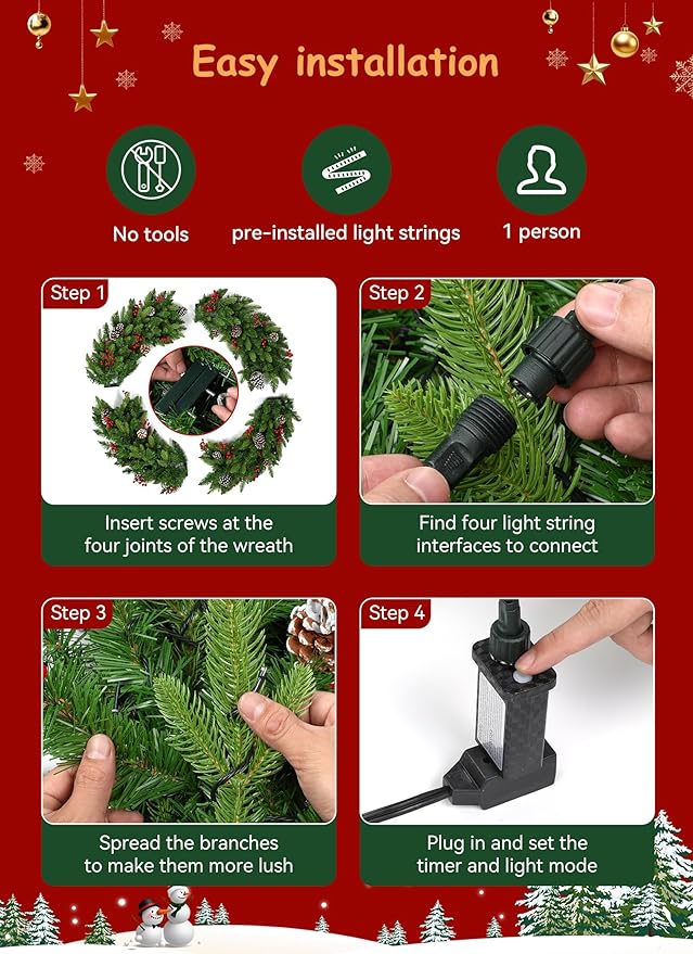 - 【Energy-Saving & Convenient Timer】Powered by an ETL-certified all-in-one adapter for safer and greater durability, with a 9.8ft long lead—no need for extension cords, even in different scenarios. The christmas wreath with lights has a built-in timer (auto on for 6hrs, off for 18hrs) and memory function, saving energy while avoiding repeated settings.