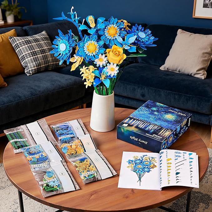 - Lifelike Bouquet Design: Inspired by Van Gogh’s Starry Night, the Starry Blooms Flower Bouquet Building Set blends dreamy blue and yellow tones with 512 ABS bricks into 14 realistic flowers, including lotus, rose, dahlia, iris, Ranunculus, and more. Each bloom features intricate details and vibrant colors, creating a natural, elegant bouquet that stands out in any home or office
