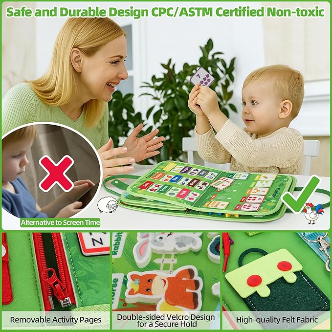 • Safe and Durable Design: CPC/ASTM certified non-toxic felt—no hard edges or loose parts. Certified educational toys with safety certification, all parts are securely stitched to withstand toddler use. Suitable for children over 3 years old and ideal for children with special sensory needs. A zippered pocket keeps small felt accessories organized and prevents them from getting lost.