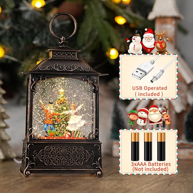 - 2025 Snow Globe: A beautifully crafted snow globe lantern illuminated by warm white LEDs brings a magical winter wonderland to life. Watch as shimmering silver glitter swirls like falling snow around festive figures, creating a captivating sparkling effect.