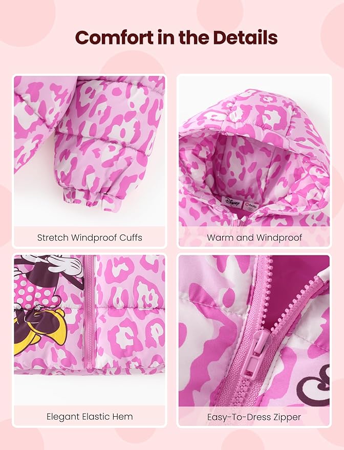 - Charming & Unique Design: Inspired by Disney’s Minnie Mouse, this stylish puffer jacket features a fun camouflage print with Minnie’s signature polka dots, reflecting her playful and fashionable personality. With a cozy hood and puffy down filled insulation, it provides warmth and protection from the wind. The thick hoodies jacket padding and full inner lining ensure your toddler stays snug and protected during the coldest days