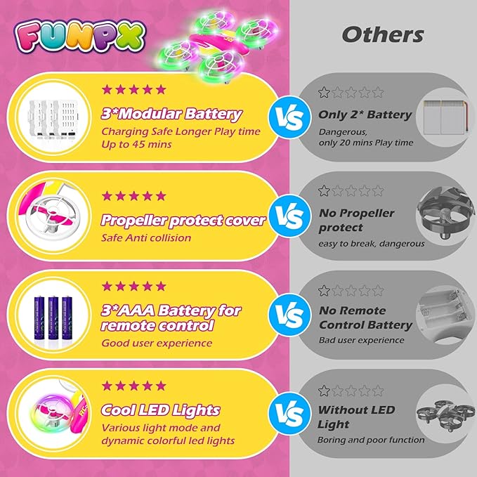 - 🛡 Kid-Safe Design: Crash-Resistant ABS & Full Protection: Built tough with lightweight, crash-resistant ABS body and full-coverage propeller guards for safety. Red LED low-battery warning signals when to land safely. Includes 3 modular batteries for 45 minutes total flight time!