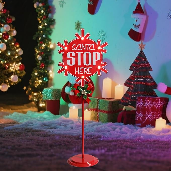 - Festive Santa Stop Sign Design: This decorative piece features a vibrant red and white color scheme with a playful "Santa Stop Here" message. It's adorned with a festive bow and topped with twinkling lights, making it a fun and eye-catching addition to any Christmas decor