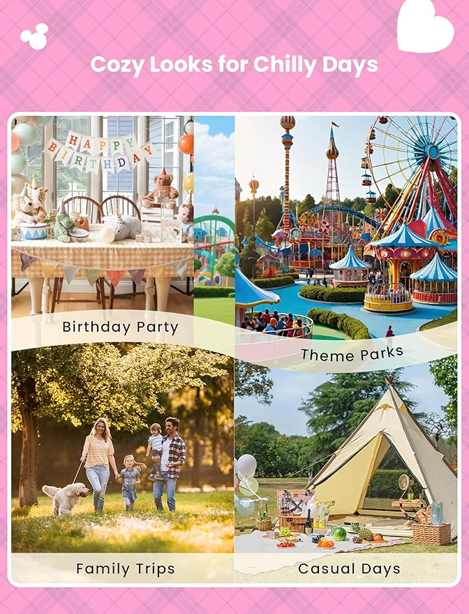 • Elegant 2-Piece Design: This cozy Disney skirt set includes a knit top featuring a bold Minnie Mouse or Daisy Duck graphic, pearl-style buttons, and delicate star accents. It’s paired with a classic plaid skirt made from tweed-style fabric, combining warmth, texture, and timeless style for fall and winter wear