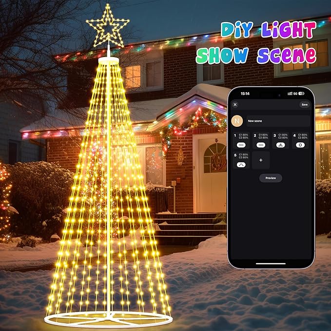 - SYNC WITH MUSIC: Create an immersive music experience, let 12ft outdoor christmas tree dance with you! Led smart Outside Christmas tree lights are equipped with a variety of music modes, turn on "Music Mode" in the app, select your preferred music setting, and play your favorite songs. Synchronized christmas lights outdoor with music, which make smart christmas lights outdoor change with the rhythm of the music. Different songs bring unique light dances, bringing a more vivid visual feast for your Christmas.