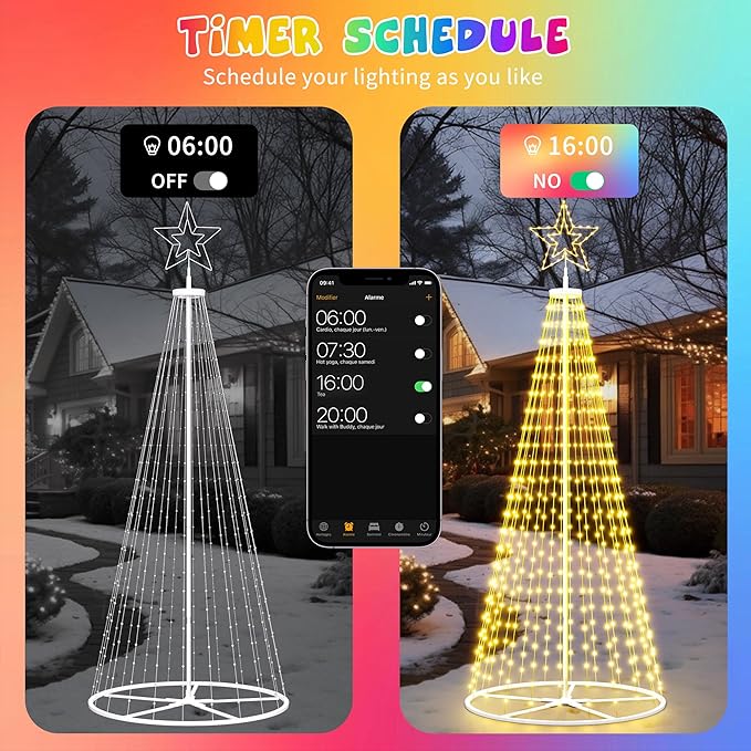 - THOUGHTFUL TIMER FUNCTION: Press the corresponding timer button to set your preferred mode of the LED christmas light Outside, or cancel anytime with "Timer Off". Let the large 12ft outdoor Christmas tree turn on and off at the time you set. Customize the day and night of your home. It automatically remembers your last settings—colors, lighting modes, dimmer, etc. Save energy and effort with timer function, making life easier.