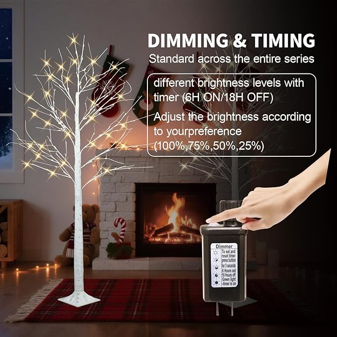 - Adjustable brightness: Choose from 4 brightness levels (100%, 75%, 50%, 25%) with the convenient adapter button. Features a built-in timer that automatically turns the tree on for 6 hours and off for 18 hours at your selected brightness
