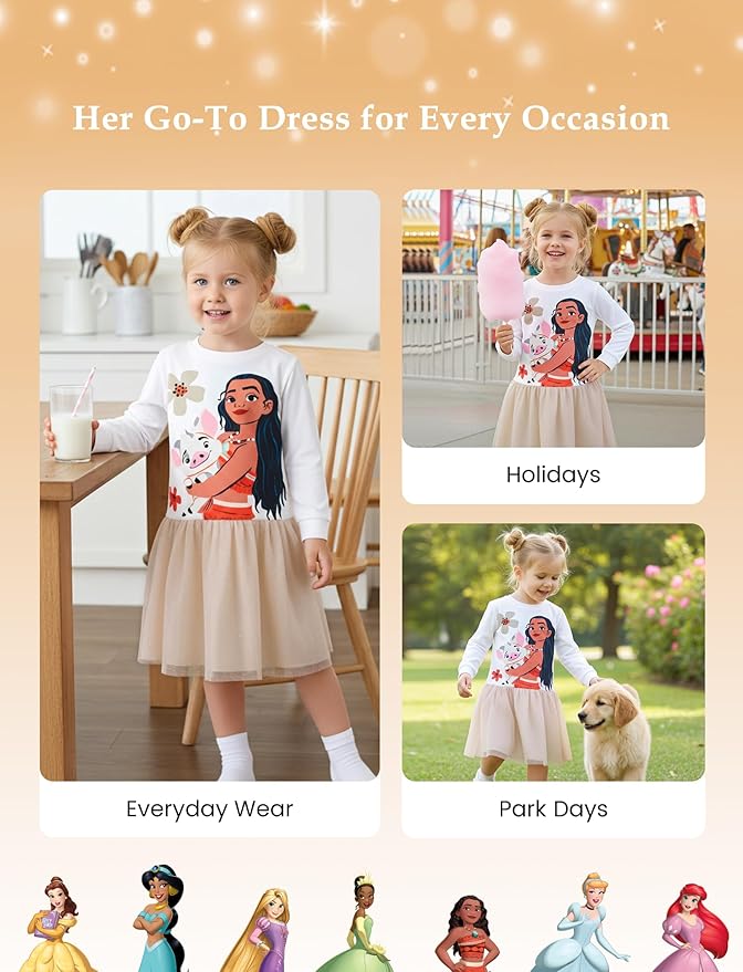 • Charming & Unique Design: This toddler princess dress blends the cozy style of a sweatshirt with the elegance of a mesh skirt. The top features a bold and colorful print of Moana and Pua, set against a white background, paired with floral accents for added charm. The bottom half is a light beige tutu skirt, giving it the full effect of a princess dress
