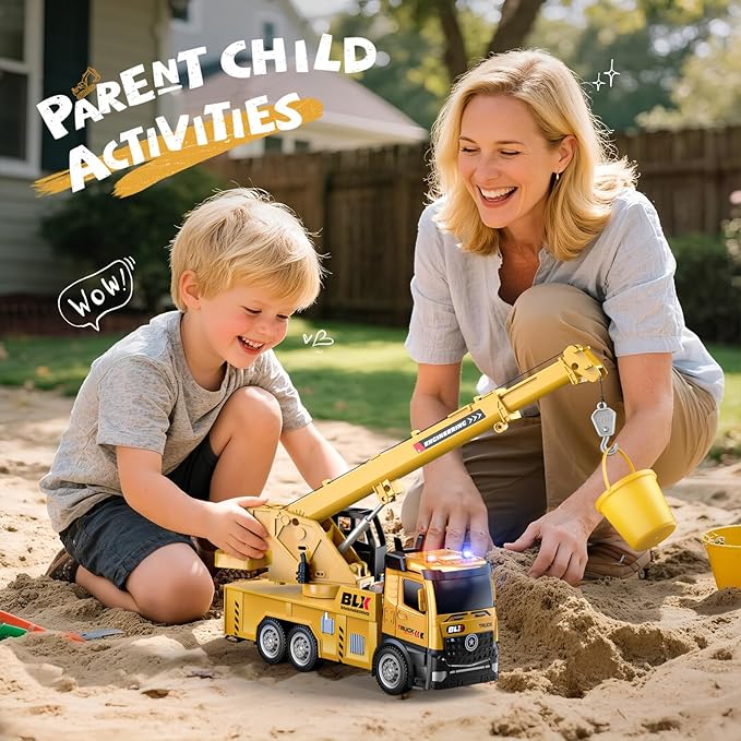 - Realistic Sound And Light Effects - Each vehicle features realistic sound and lighting activated by pressing, excavator emits rumbling sounds with yellow lights, crane has rotating mechanical sounds & red warning lights, dump truck produces “clunk” sounds when tilting its bed, and mixer drum rotates with blue lights and mixing sounds. This immersive design enhances play realism, making kids feel like they’re on a real construction site.